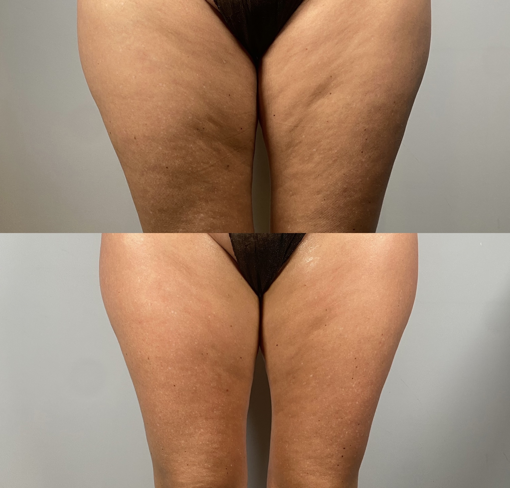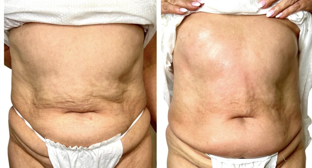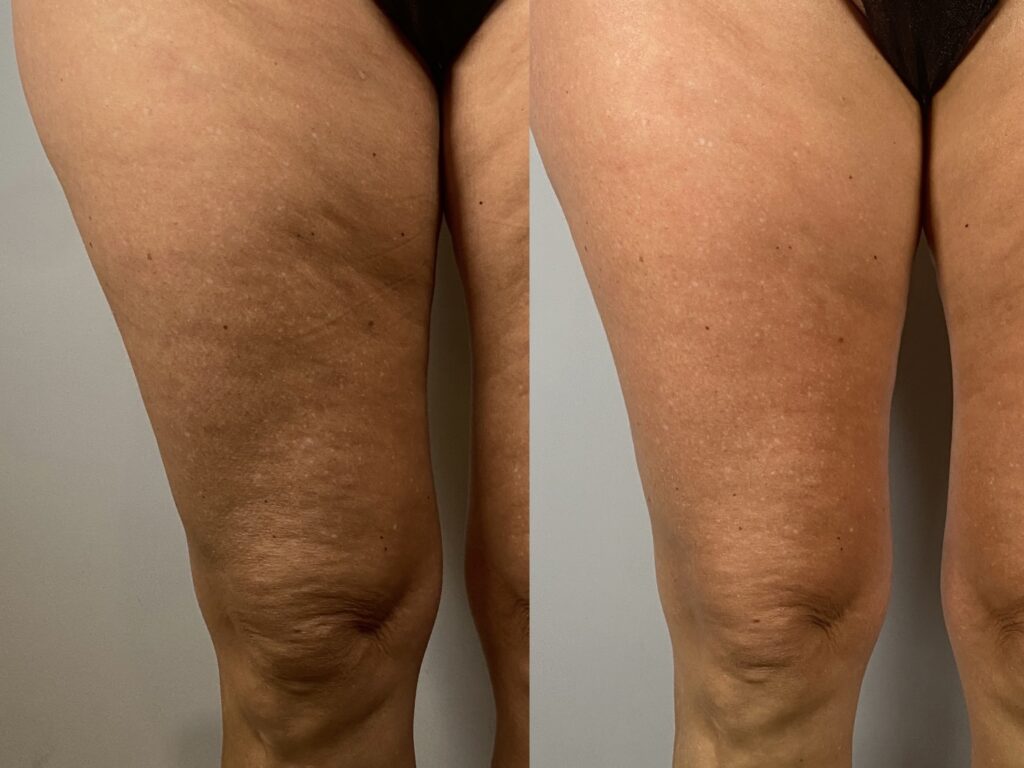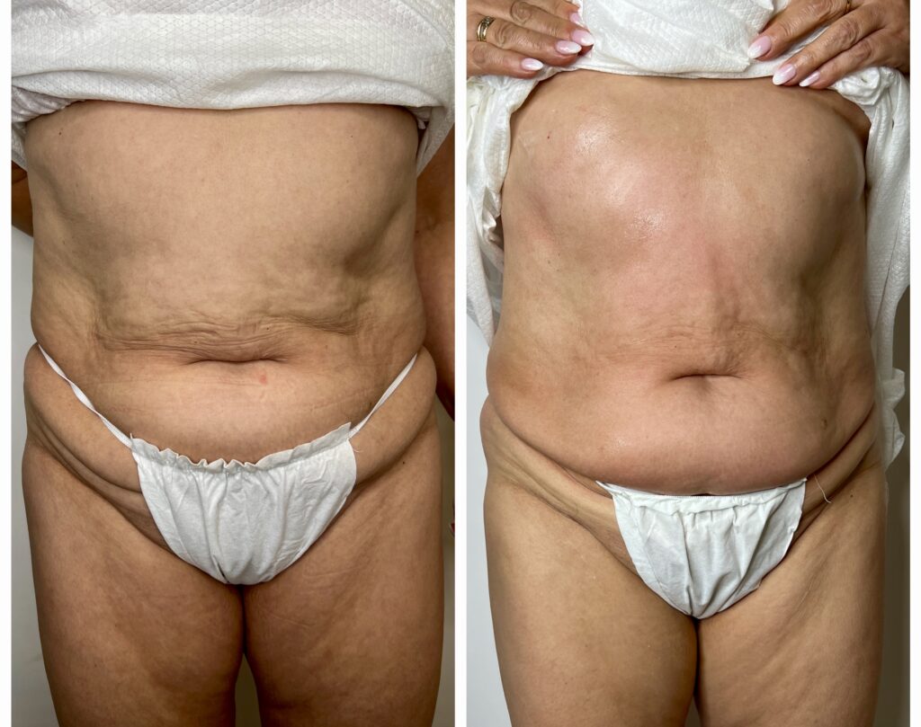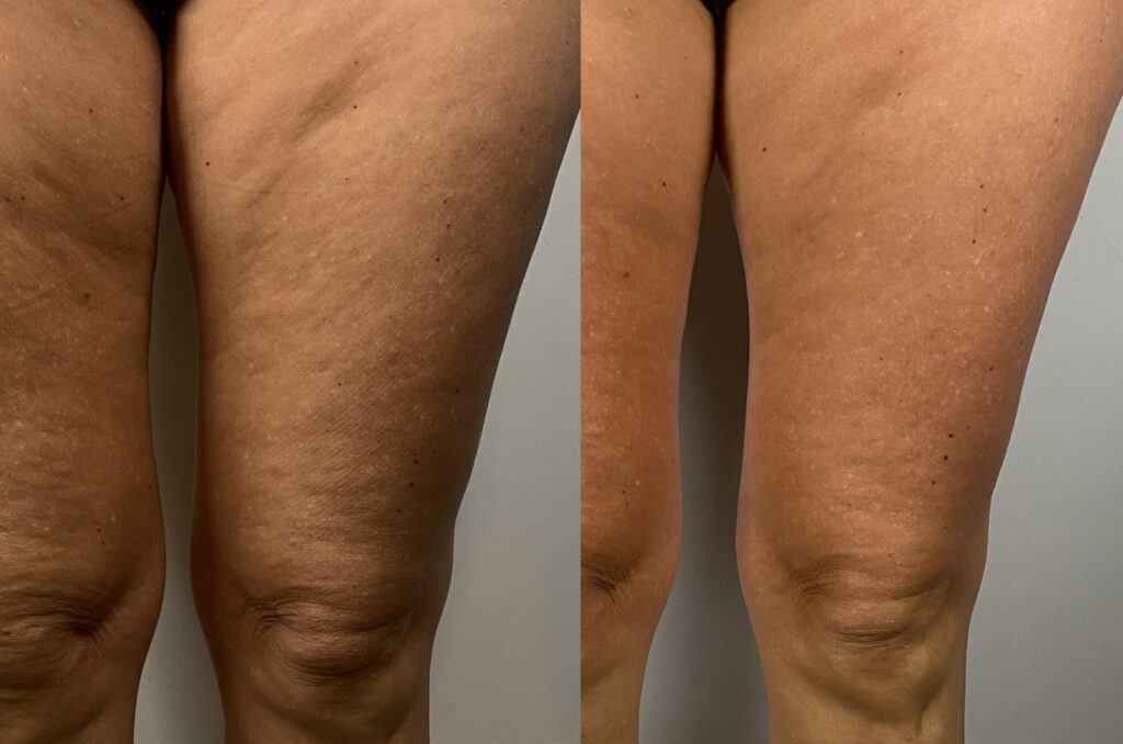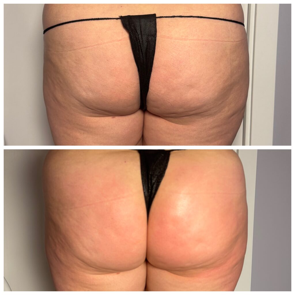 Pierwsze efekty ujędrnienia skóry są widoczne bezpośrednio po zabiegu. W kolejnych tygodniach, wraz z kontynuacją serii, skóra stopniowo się zagęszcza, a poprawa metabolizmu tkanek sprzyja także zmniejszeniu obwodów, dzięki czemu efekt ujędrnienia staje się coraz bardziej widoczny i trwały.